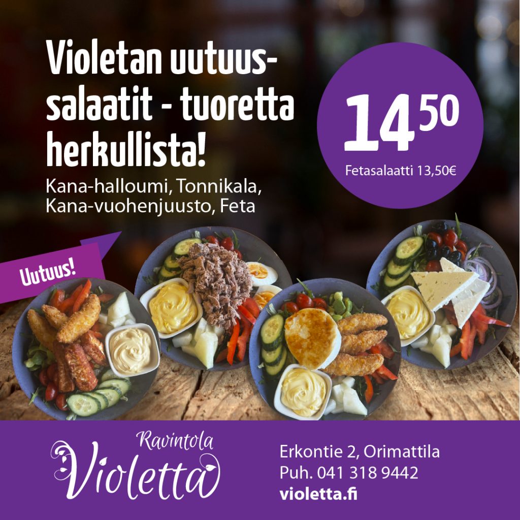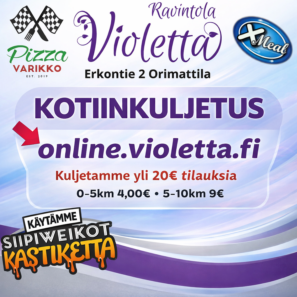 Ravintola Violetta tarjoaa Xmeal hampurilaisia, kanan siipiä siipiweikkojen kastikkeilla, sekä aidosti kotimaisen pizzavarikon pizzoja, sekä toki myös violetan omia annoksia. Ravintolassamme on myös kattava juomavalikoima.